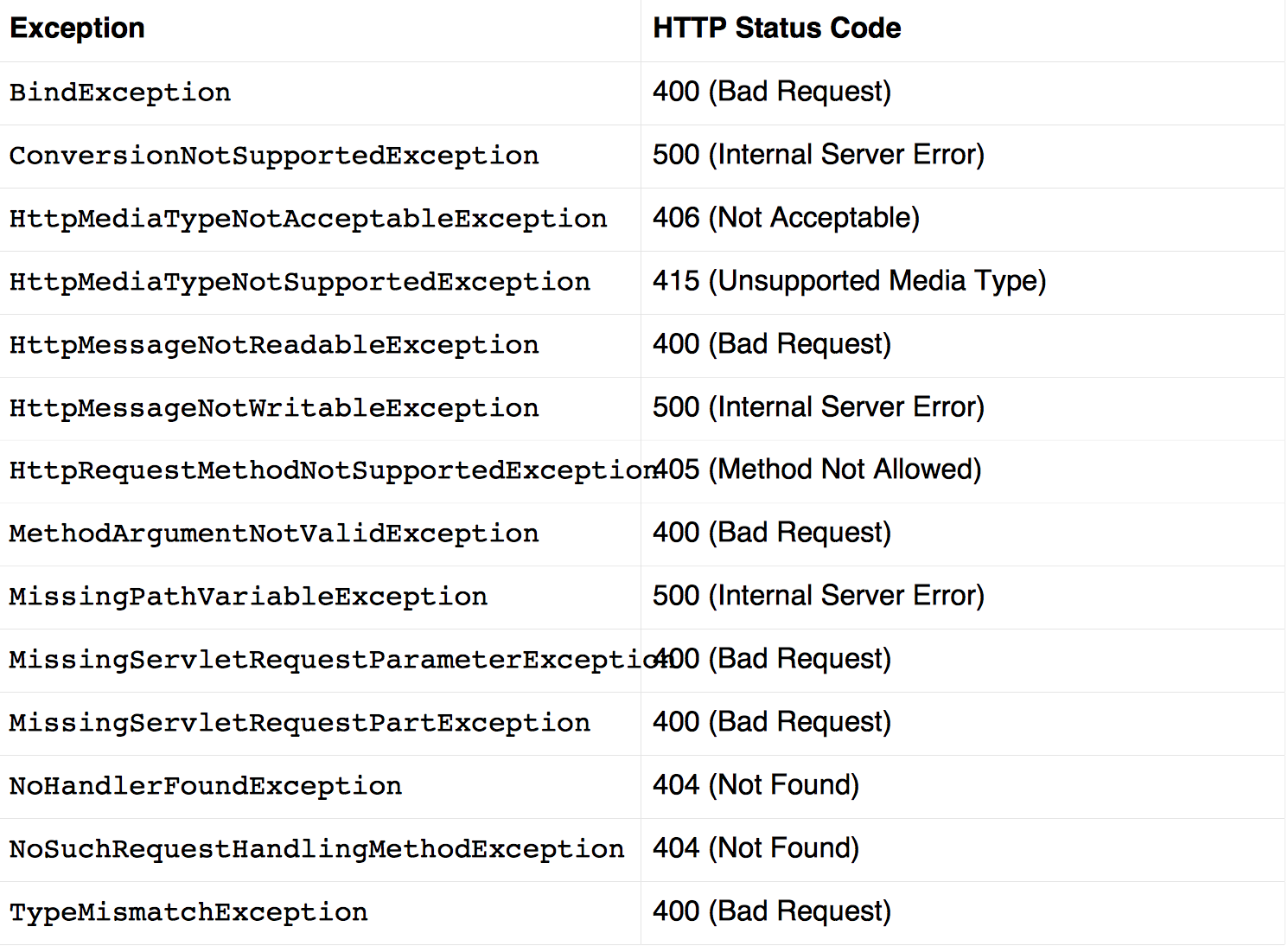 默认状态下 Spring MVC 异常和状态码的对应关系表: